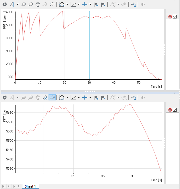 The 'Time' and 'RPM' channels should still be selected in the Data Portal (if they are not, select the 'Time' channel, and then the 'RPM' channel). Drag and drop the channels into the lower VIEW sheet area, and select '2D Axis System' when the popup menu appears. The two channels will be plotted in the lower VIEW sheet area, and the band cursor will be configured exactly as it was in the upper VIEW sheet area. Note that the lower VIEW sheet area was configured exactly the same as the upper area because the VIEW sheet toolbar settings are relative to each VIEW sheet. If you created a new VIEW sheet and configured a different cursor option such as 'Frame Cursor' or 'Free Cursor', those setting would be unique to the actively displayed VIEW sheet.