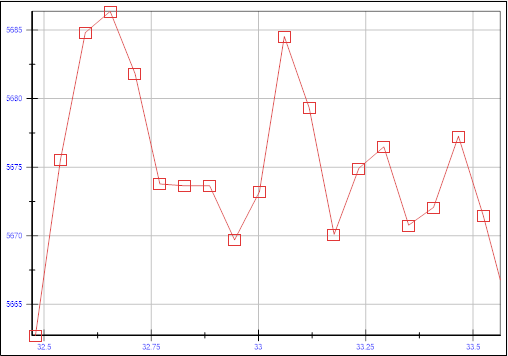Load the '2D Axis System' settings dialog for the 2D Axis System in the VIEW sheet upper left area. Drag and drop the 'PeakY' channel from the Data Portal to the '2D Axis System' dialog, curve No. 1, 'Y-Channel'. Drag and drop the 'PeakX' channel from the Data Portal to the '2D Axis System' dialog, curve No. 1, 'X-Channel'. Change the 'Color' for curve No. 1 to 'No Color'. Click on the curve No. 2 'Properties' button and configure the 'Markers' as shown below. Activate the 'Labels' tab and configure it as shown below. Click the 'OK' button to close the 'Curve Properties' dialog. In the '2D Axis System' dialog, set the 'Scaling' to 'Manually over all curves' and set the Y-Axis end value to '7000'. Click the 'OK' button to close the dialog. The peak values for the 'RPM' channel are now shown and identified with a marker for the first 10 seconds of the channel.