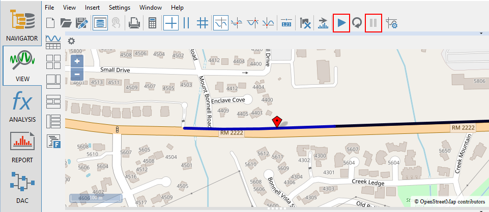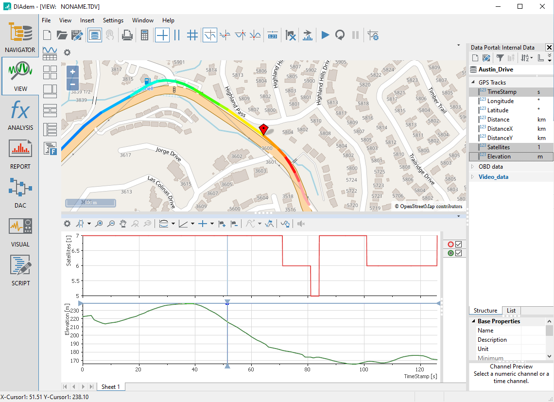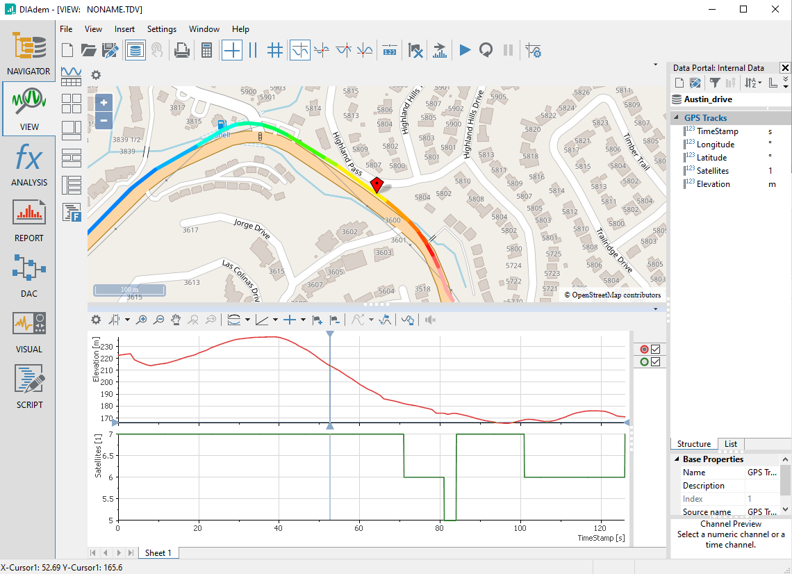 To run the example above in DIAdem, activate the NAVIGATOR panel, clear the Data Portal, and then load the data file 'Austin_Drive.tdm' from the folder: 'C:\Program Files\National Instruments\DIAdem ####\Examples\Data\'. Activate the VIEW panel, create a new VIEW layout, and then load the example file 'Austin_Drive.tdv' from the folder: 'C:\Program Files\National Instruments\DIAdem ####\Examples\Documents\'.