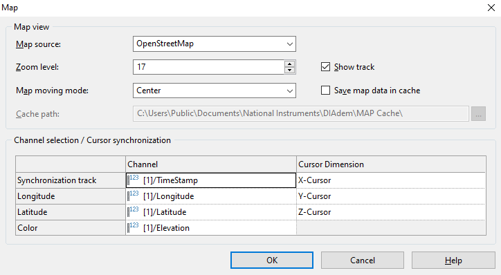 To run the example above in DIAdem, activate the NAVIGATOR panel, clear the Data Portal, and then load the data file 'VIEW_MapDisplay.tdm' from the folder: 'C:\Program Files\National Instruments\DIAdem ####\Examples\Data\'. Activate the VIEW panel, create a new VIEW layout, and then load the example file 'VIEW_MapDisplay.tdv' from the folder: 'C:\Program Files\National Instruments\DIAdem ####\Examples\Documents\'.