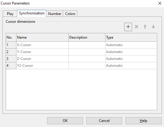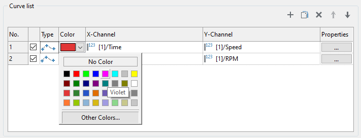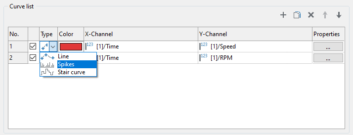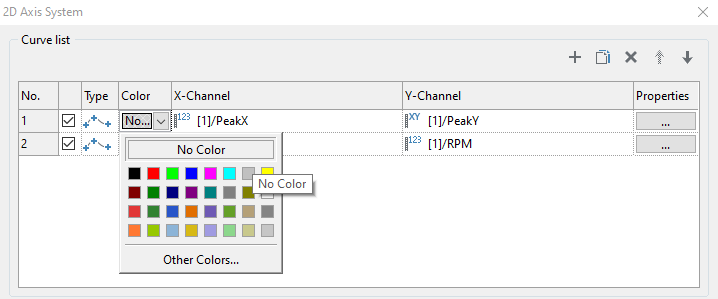 The upper section of the dialog labeled 'Curve List' will list any curves assigned to the 2D Axis System. You may use the toolbar within the Curve List frame to edit, add, and delete curves. Within a specific Curve List Item, the column 'No.' identifies the curve, and the checkbox enables or disables the display of the curve. The column 'Type' allows you to select between a curve type of 'Line', 'Spikes', and 'Stair curve'.