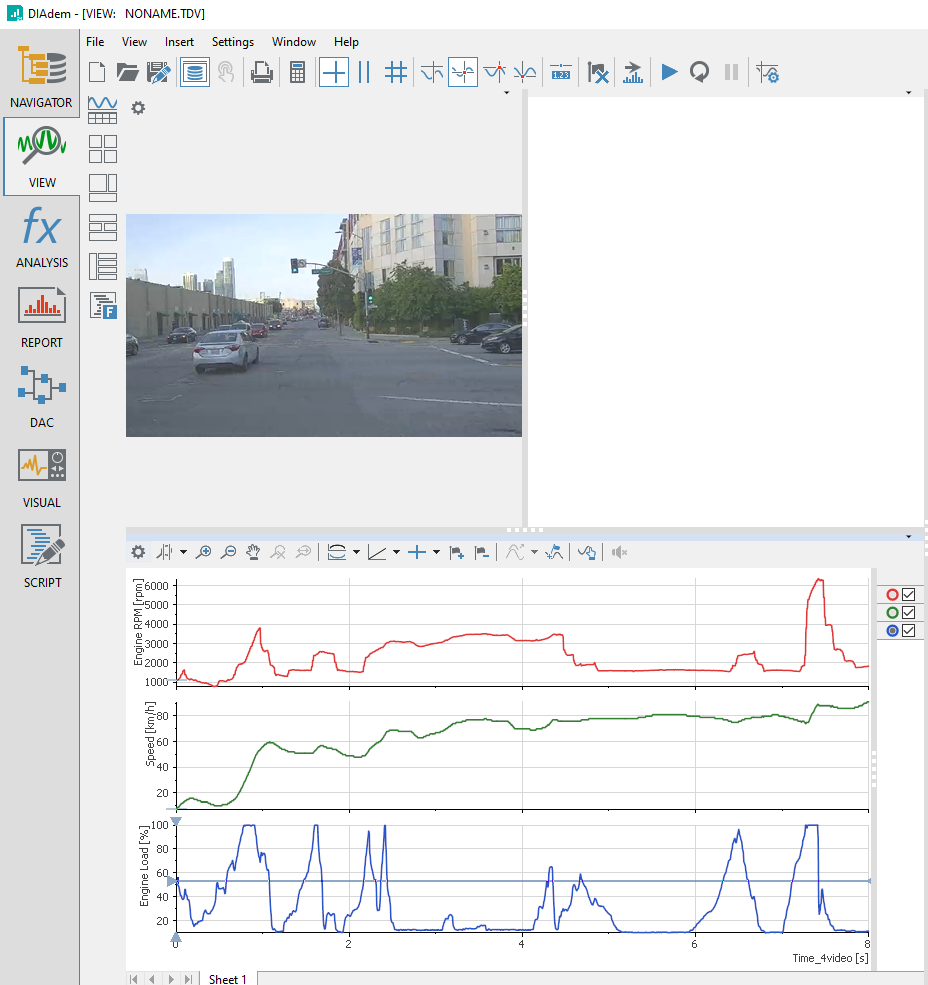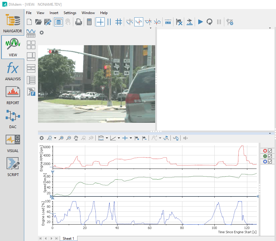 This example shows data recorded from the vehicle CAN bus, along with simultaneously recorded video, and GPS data. All of these different types of data are shown in a single VIEW sheet, using the different area types available in DIAdem. Synchronization was accomplished by using the numeric time channel for the time series data, and the latitude and longitude channel data.