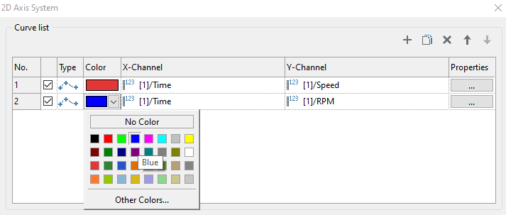 Load the '2D Axis System' settings dialog for the 2D Axis System in the VIEW sheet upper left area, and change the color for curve No. 2 to 'Blue'.