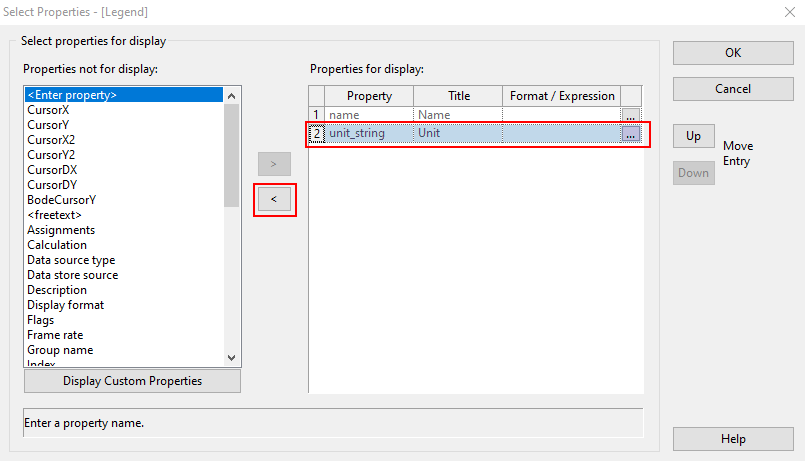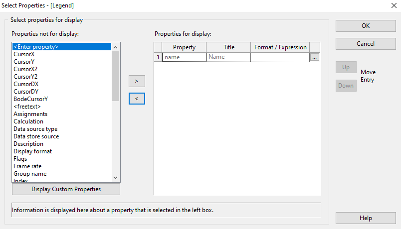 Access the legend settings by right clicking on a 2D Axis System and choosing 'Legend...' from the popup menu. Remove the display of the 'Unit' by selecting the second row in the 'Properties for display:', and then clicking the '<' button to the left. Note the list of channel properties in the 'Properties not for display:' that could be added to the legend. Click the 'OK' button to close the dialog.