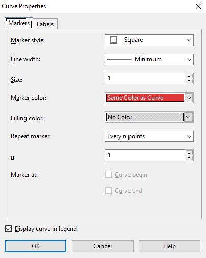 Clicking on the 'Properties' button for a curve loads the 'Curve Properties' dialog. Click on the 'Markers' tab to activate it, and then change the 'Marker style:' from 'None' to 'Square'. Click the 'OK' button to close the 'Curve Properties' and then again to close the '2D Axis System' dialog.