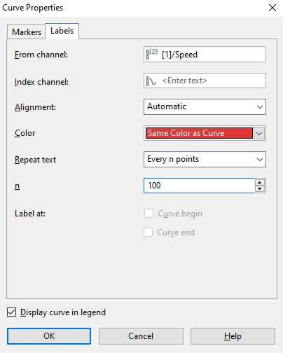 Go back to the 'Curve Properties' dialog, and change the marker to appear every '100' points. Click on the 'Labels' tab to activate it. Drag and drop the 'Speed' channel from the Data Portal to the 'Labels' tab channel control labeled 'From channel:'. Set the 'Alignment:' to 'Automatic'. Set the 'Repeat text' to 'Every n points', and then set the 'n' option to '100'. Click the 'OK' button to close the 'Curve Properties' and then again to close the '2D Axis System' dialog.