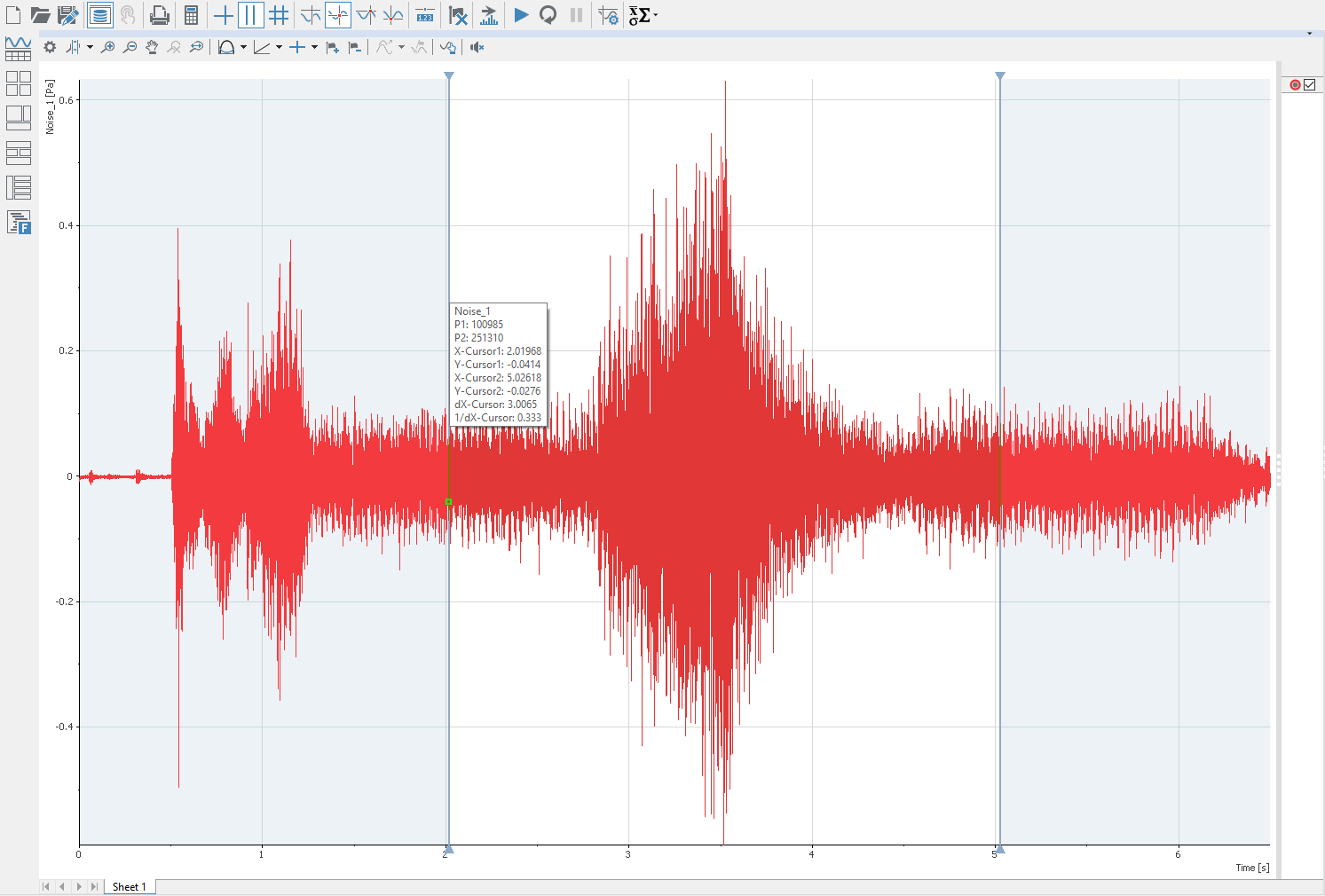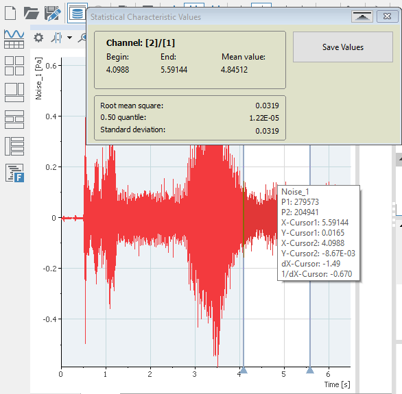 Note that the 'Statistical Characteristic Values' dialog is non-modal, meaning that you can move your mouser cursor in the VIEW sheet area, click between the band cursor, move the band cursor, and the values in the dialog will be updated.
