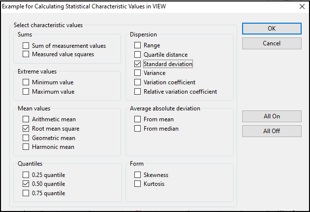 Click on the 'View Statistics' icon in the VIEW toolbar, and choose the option 'Enable VIEW Statistics'. A dialog titled 'Example for Calculating Statistical Characteristic Values in VIEW' will appear. Click the 'All Off' button to remove checks from all check boxes. Then check the options 'Root mean square' under 'Mean values', '0.50 quantile from 'Quantiles', and finally 'Standard deviation' from the section titled 'Dispersion'. Click the 'OK' button when finished.
