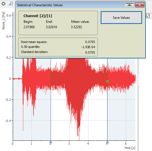 Another dialog will appear named 'Statistical Characteristic Values'. The three statistical metrics you selected will appear in the dialog, along with information about the band cursor position in terms of the X values.